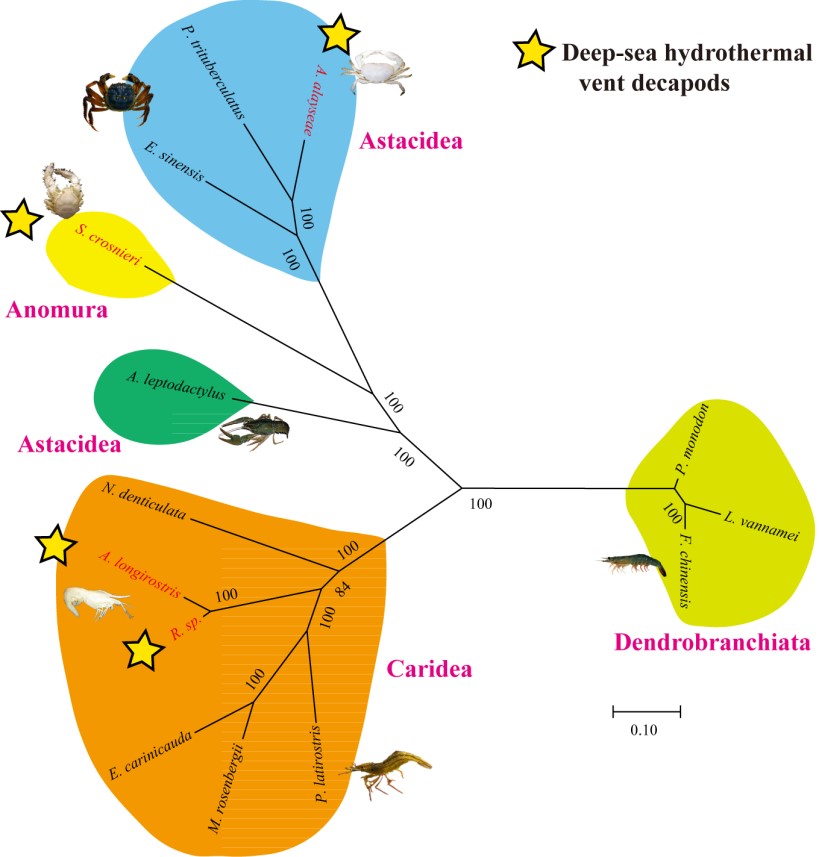 近日,进化生物学Top期刊Molecular Ecology在线刊发中国科学院实验海洋生物学重点实验室李富花研究组完成的题为“Adaptation and molecular evidence for convergence in decapod crustaceans to deep-sea hydrothermal vent environments”的研究论文。该研究首次发现深海热液甲壳动物趋同进化的表型及分子证据,揭示了白色体色和化能合成营养代谢的关键遗传机制,为揭秘深海物种环境适应的独特机制提供了新的理论依据。