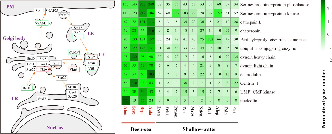 研究人员以公共数据为基础,开展大数据深度挖掘,通过对4个深海和10个浅海十足目甲壳动物的比较转录组学分析,发现了深海物种趋同进化的关键分子证据。系统发生分析显示这些深海物种起源于不同祖先,其相似表型的产生并非直系遗传。进一步分析发现发现深海物种中SNARE介导的膜泡运输通路是受很强的正选择和平行进化的通路,其大分子特异性运输的功能在化能合成营养代谢过程中扮演着重要角色,且能量代谢和蛋白质合成与加工相关基因的趋同进化也与化能合成的营养机制密切相关。深海热液甲壳动物白色体色的形成则与甲壳蓝蛋白基因家族的收缩以及低虾青素含量有关。