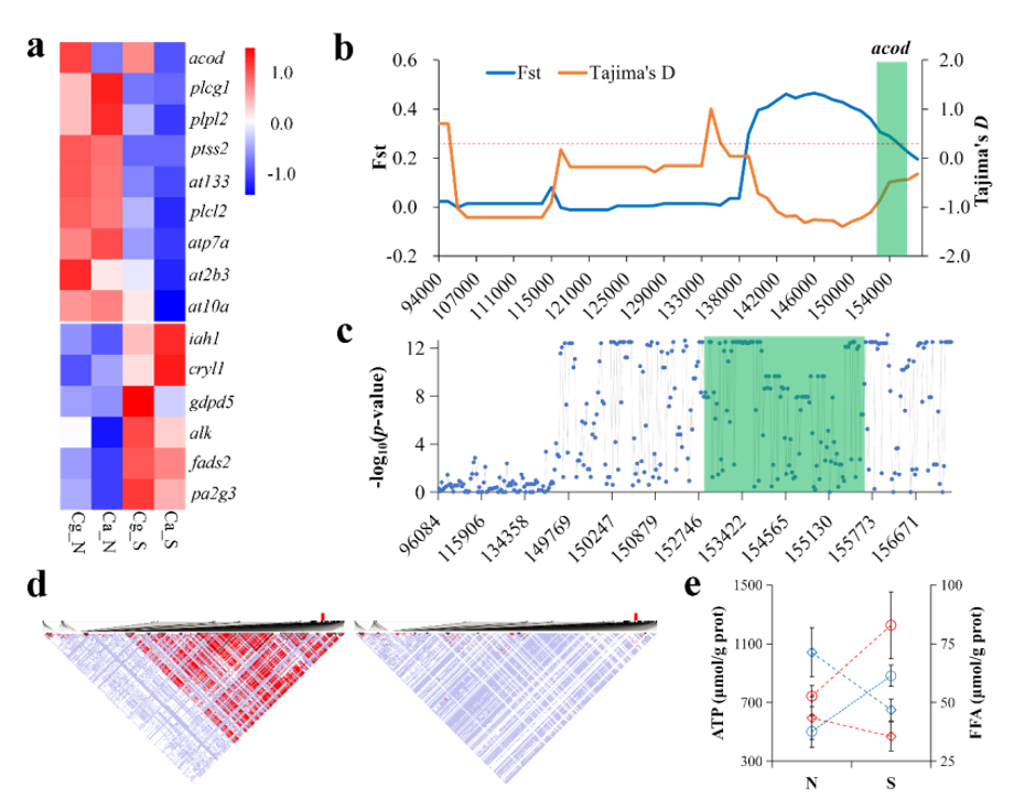 遗传分化与表型可塑性作为进化的两种重要驱动力量,其相互关系一直是适应进化领域研究的热点与难点。本研究以长牡蛎与福建牡蛎为研究对象,解析遗传分化和可塑性在高温适应中的作用权重。研究发现南方福建牡蛎表现出更高的适应性表达可塑性,受选择基因同时作为环境响应基因,其在非编码区表现出更强的遗传变异特征。南方牡蛎具有更强的ATP(三磷酸腺苷)合成和脂肪酸分解能力;而北方牡蛎ATP消耗和脂肪酸合成能力更强,说明脂肪酸和ATP代谢间的能量代偿在长牡蛎和福建牡蛎适应南北环境中发挥了重要作用。总之,该研究成果揭示了非编码区变异和基因表达可塑性介导的能量分配在高温适应中的重要作用。