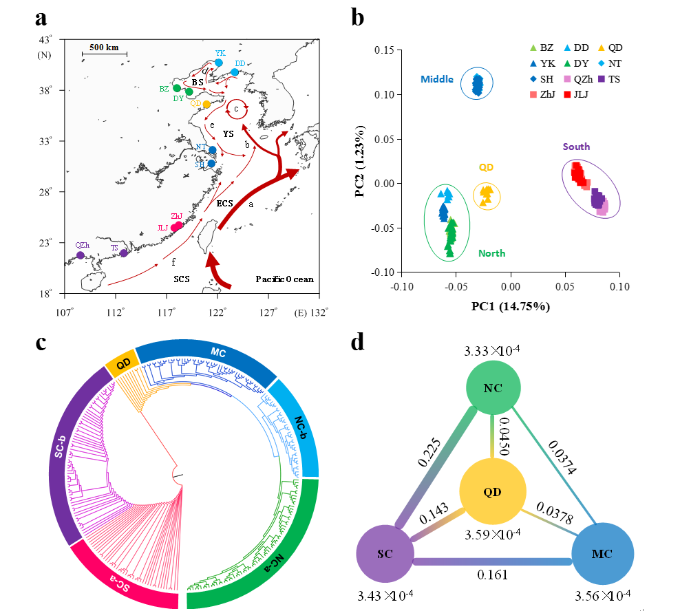 现阶段关于近江牡蛎地理分布格局的形成及其对温度和盐度的适应机制研究仍然缺乏。本研究获得了近江牡蛎染色体水平的高质量基因组(613.89 Mb),contig N50为6.97 Mb,是目前已知的海洋软体动物中连续性最好的基因组。此外,本研究解析了我国各大河口区近江牡蛎的遗传结构:大体分为3个地理群体,即北部渤黄海群体、中部长江口附近群体以及南部福建以南海域群体。这一群体结构的形成与我国南北中河口区的温盐梯度、我国沿岸的海流流向、历史上的地质事件以及近百万年来的冰期/间冰期的周期性变化规律有关。利用选择性清除分析技术,鉴定出51个具有受选择信号的候选基因,且多数是响应盐度和温度变化的。响应环境变化的高可塑性基因的上游非编码调控区表现出更强的遗传分化,这与近江牡蛎近缘种长牡蛎与福建牡蛎姊妹亚种间的适应分化机制一致。