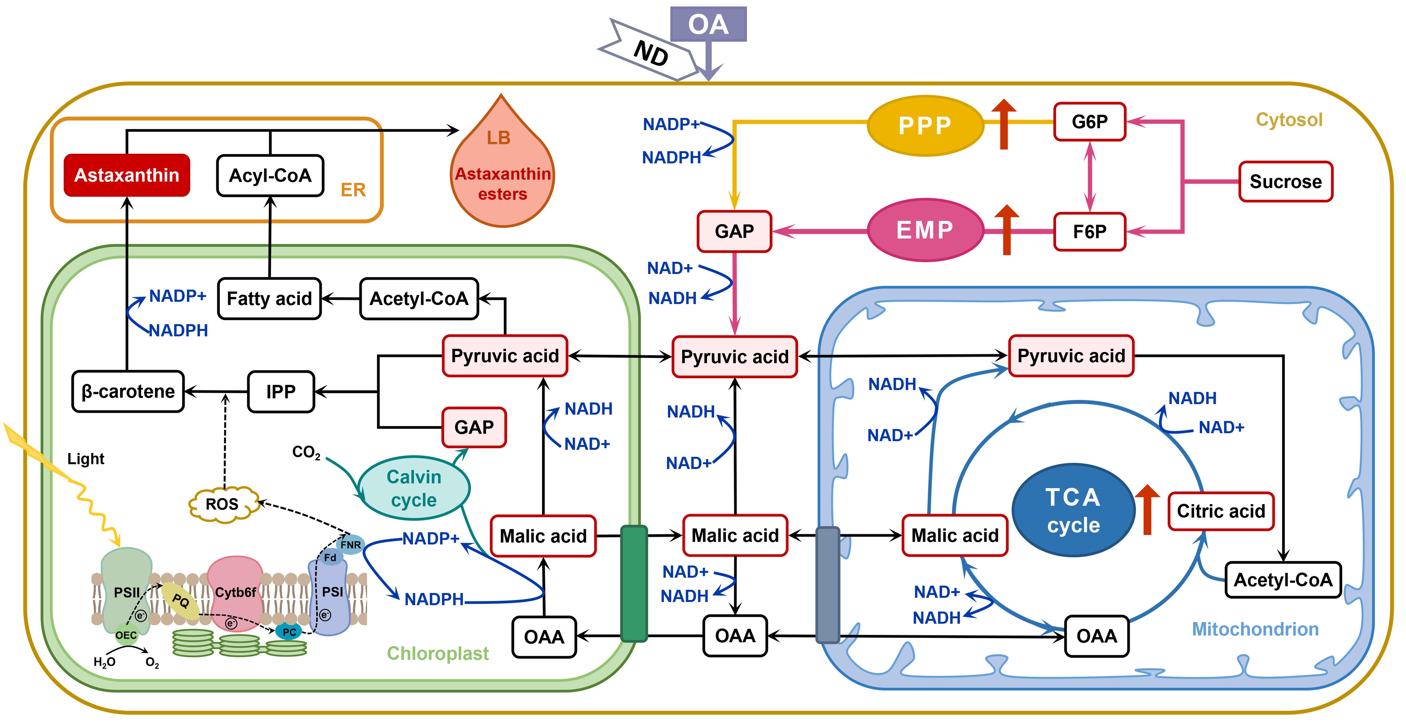 博士研究生于文杰为第一作者,刘建国研究员为通讯作者的另外两篇文章,主要通过外源添加呼吸作用中间代谢产物的方法,进一步证实非光依赖性呼吸作用的能量代谢中心枢纽——TCA循环,可为虾青素合成过程提供碳骨架,促进虾青素在细胞内的大量积累。其调节机制具体为:中间代谢产物延胡索酸可提高呼吸代谢的EMP、TCA和PPP三条主要途径,使得丙酮酸和三磷酸甘油醛水平显著提高,一方面通过促进虾青素合成前体异戊烯焦磷酸的生成,直接促进虾青素合成,另一方面还促进了脂肪酸的合成,进而加速虾青素酯化过程,间接促进虾青素合成。TCA循环的另一代谢产物草酰乙酸可通过提高底物和NADPH水平,直接促进红球藻虾青素合成。相对而言,草酰乙酸的促进作用比延胡索酸更快,效果也更显著,主要得益于草酰乙酸更高效的跨膜机制。