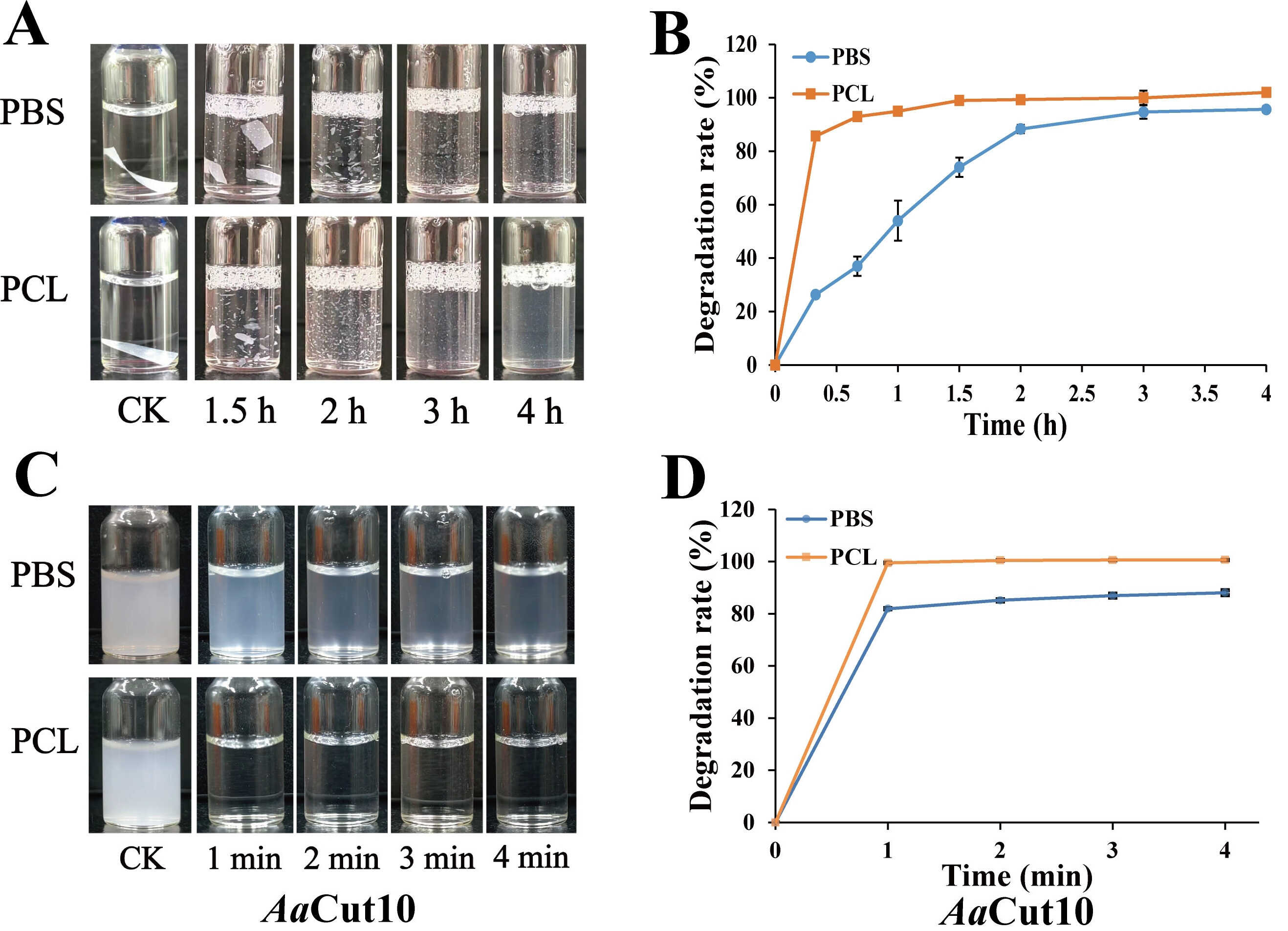 图3 海洋真菌Alternaria alternata FB1角质酶AaCut10对PBS和PCL的降解效果