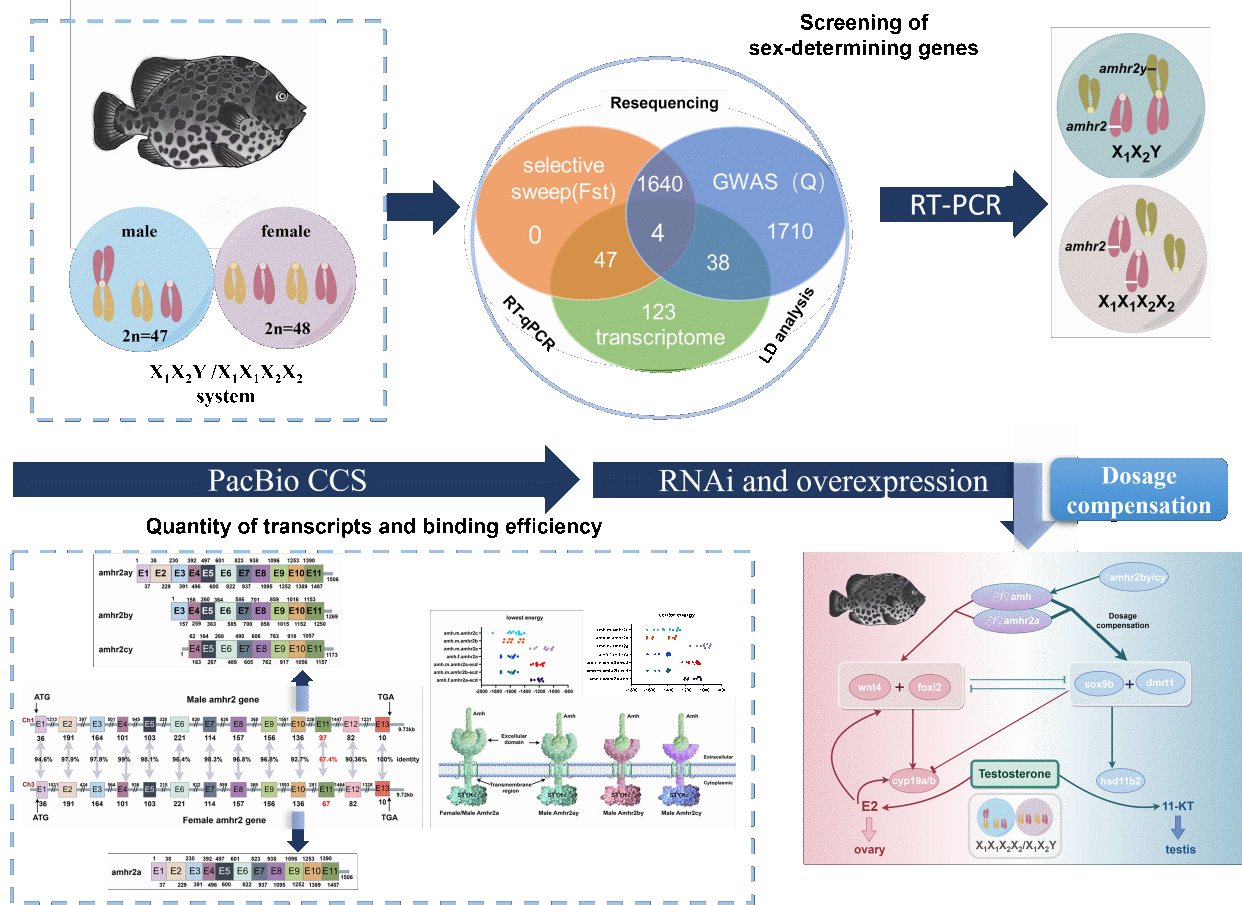 研究团队通过前期研究发现斑石鲷具有雌雄生长二态性特征,且在染色体组成上表现出显著差异:雄性个体染色体数为2n=47,较雌性(2n=48)少一条,并携带一条体型异常的巨型染色体,构成一种特殊的复性染色体性别决定系统(X1X1X2X2/X1X2Y),为探索鱼类性别决定与分化机制提供了独特研究模型。为破解斑石鲷复合性染色体系统下性别分化调控机制,研究团队整合全基因组扫描、群体进化选择性分析、GWAS分析及性腺转录组等多组学贯通方法,构建了斑石鲷的性别决定与分化调控候选基因图谱,系统锚定出包括 amhr2、wnt4、wnt7a、wnt7b、cyp19b和 wt1a 在内的6个定位于异型染色体的核心基因,并筛选出212个差异表达基因与3392个性别相关基因(P<0.05),为深入解析性别决定与分化调控通路提供关键基因资源。