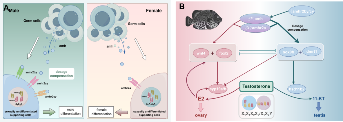 Haixia Zhao, Jun Li*, Zhizhong Xiao, Yongshuang Xiao*. Dose-dependent role of AMH and AMHR2 signaling in male differentiation and regulation of sex determination in Spotted knifejaw (Oplegnathus punctatus) with X1X1X2X2/X1X2Y chromosome system. Cell Communication and Signaling, 2025, 23: 59. https://doi.org/10.1186/s12964-025-02038-w.