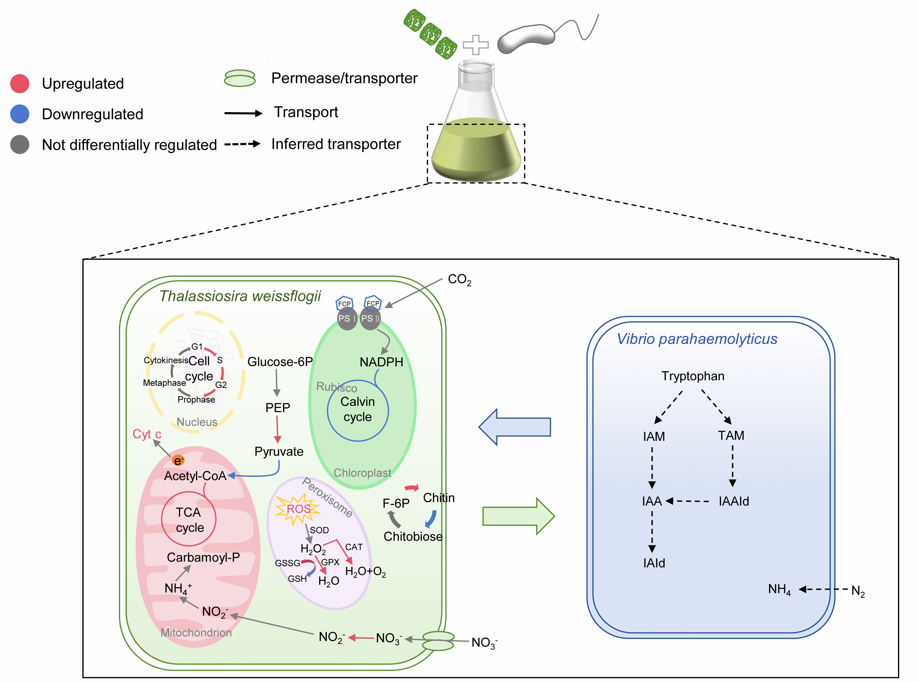 硅藻在海洋初级生产中占据主导地位,约贡献 40% 的海洋初级生产力和 20% 的全球光合固碳量。硅藻通过分泌各种代谢产物与周围微生物互作,形成独特的 “藻际环境”。已有研究表明,藻际细菌通过利用藻际高浓度光合产物、降解硅藻胞外多糖等影响海洋碳循环。然而,在这种海洋微生态环境下,硅藻的生长与代谢活动是如何变化与调控的仍不清晰。副溶血性弧菌是一类广泛存在于海洋环境中且常与硅藻共存于“藻圈”微生态系统中的微生物。本研究通过构建威氏海链藻与副溶血性弧菌的共培养体系,分析硅藻在光合作用、碳氮代谢和几丁质代谢等方面的生理变化及转录响应。