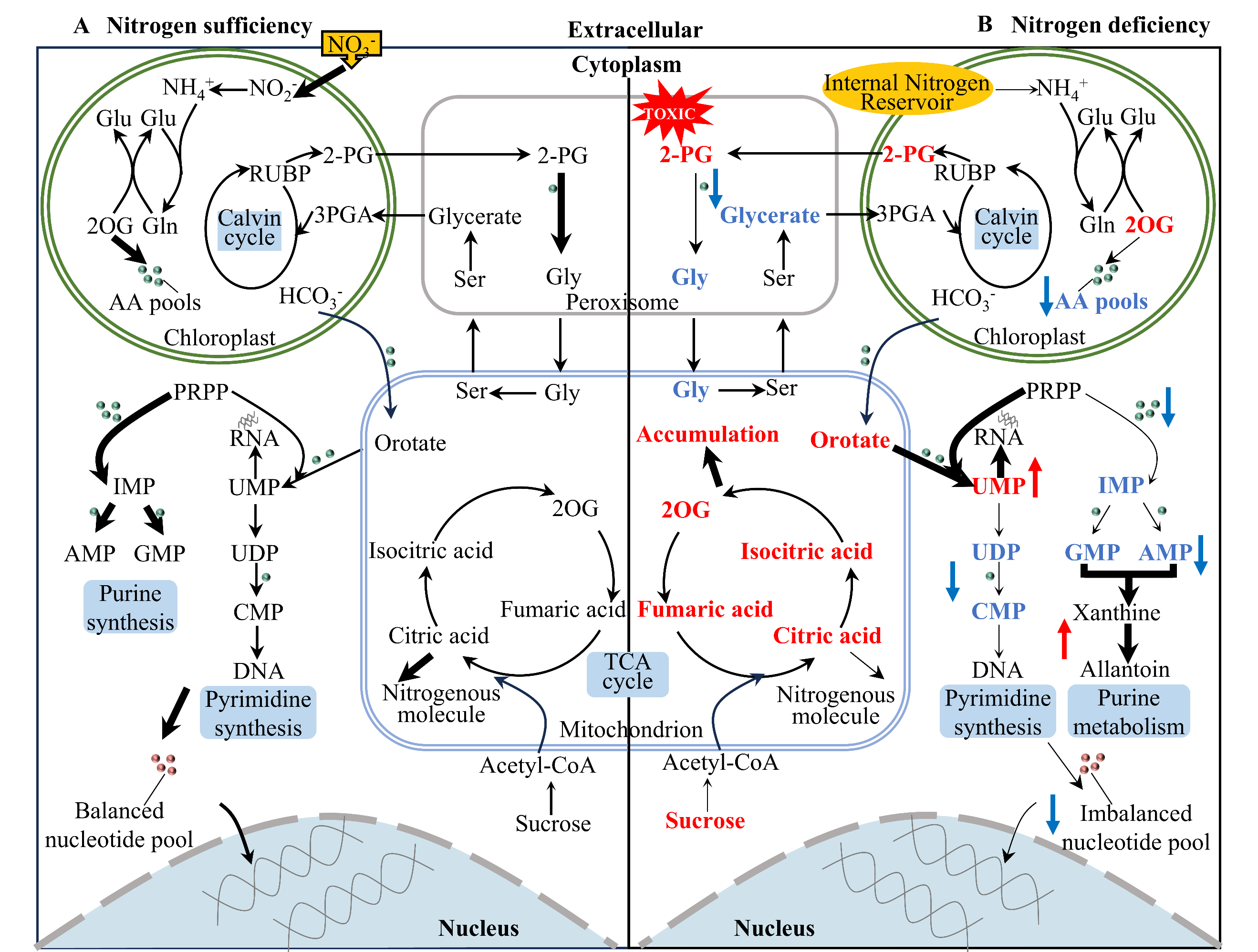相反,在缺氮条件下,红球藻嘧啶核苷酸代谢通路中的乳清酸、UMP和尿嘧啶含量显著上升,而嘌呤代谢通路中的IMP、AMP、GMP、腺苷、脱氧腺苷和次黄嘌呤含量却显著下降,核苷酸限制联合嘌呤/嘧啶的失衡共同限制了细胞分裂过程,导致细胞呈休眠状态;一旦氮源丰足,该限制解除并重新启动上述的氮激活细胞分裂的程序。