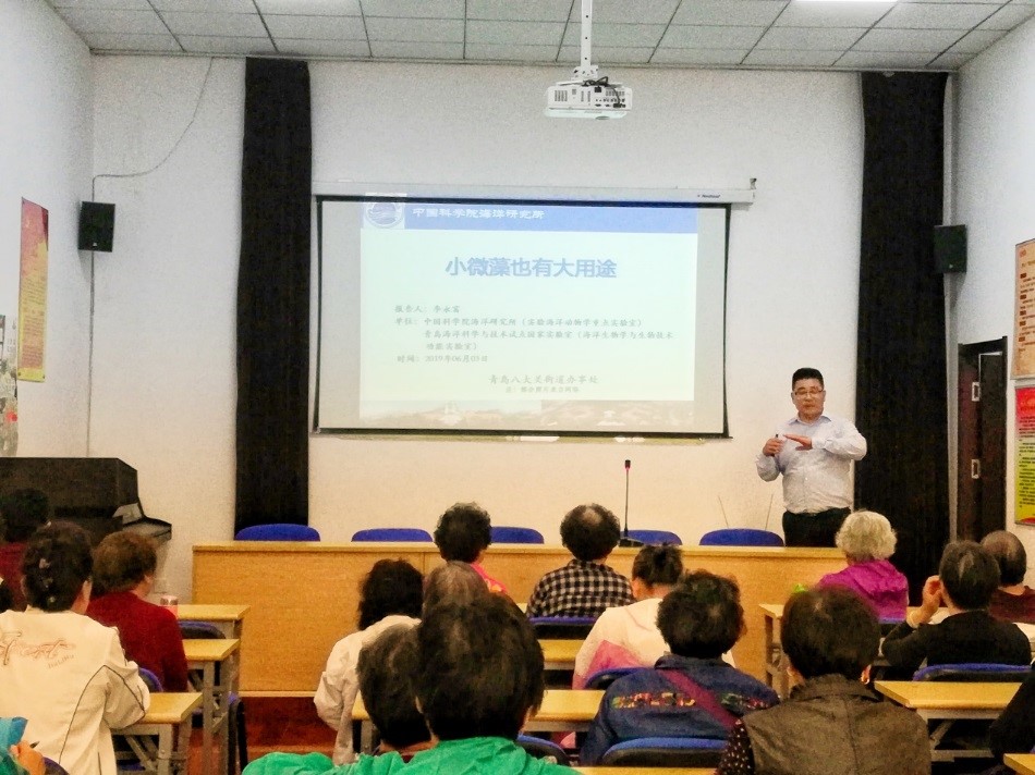 2019年6月3日,中国科学院实验海洋生物学重点实验室李永富助理研究员作为科学使者走进八大关街道办事处,参加市南区科技活动周暨“学科普知识 做科学文明老人”社区活动,并作了题为《小微藻也有大用途》的报告。