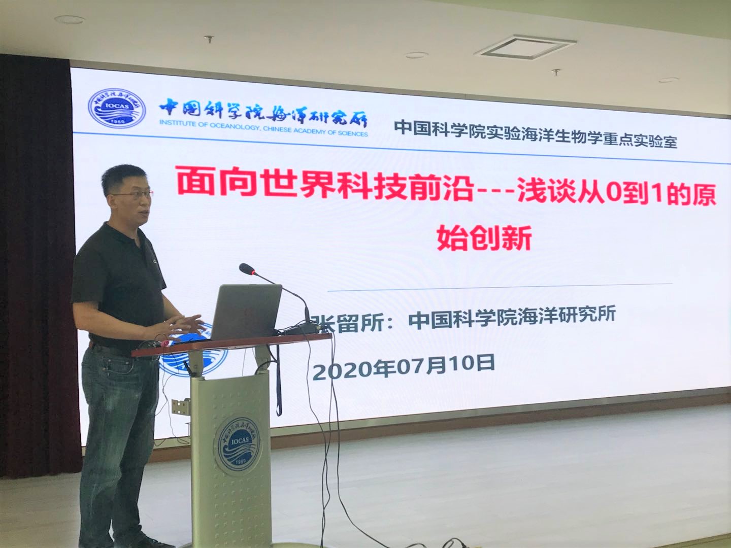 支部书记张留所同志以“面向世界科技前沿——浅谈从0到1的原始创新”为题,从时代与科研背景、什么是原始创新、海洋生命学科、原始创新展望、不忘初心追求卓越几个方面谈了自己的认识,激励科研人员不忘初心、砥砺前行,为海洋生命科学的发展贡献力量。
