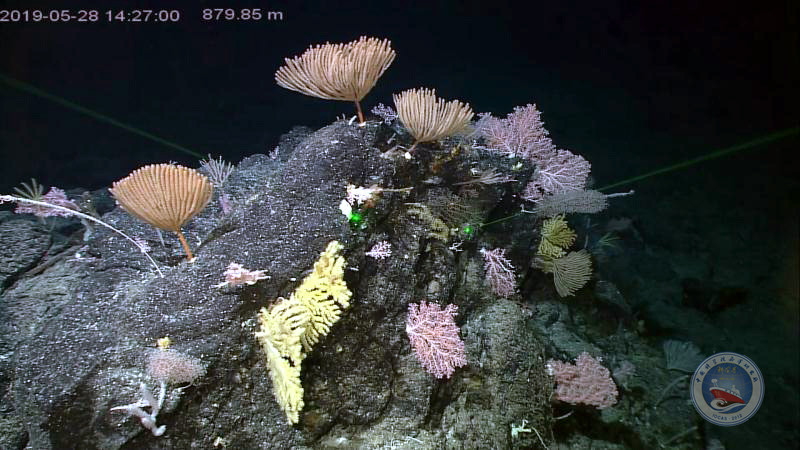 发现2:在海山东侧发现了热带寡营养深海极为罕见的大片“珊瑚林”。其中,在一处巨石上就生长着至少12种巨型动物,包括8种不同类型的、颜色艳丽的深水珊瑚及柱星螅,此外还有海百合、蛇尾、铠甲虾、深海虾、鱼类等生物在珊瑚林间生长,五彩斑斓,犹如“海底花园”一般,其壮美程度与近海珊瑚礁相比都毫不逊色。