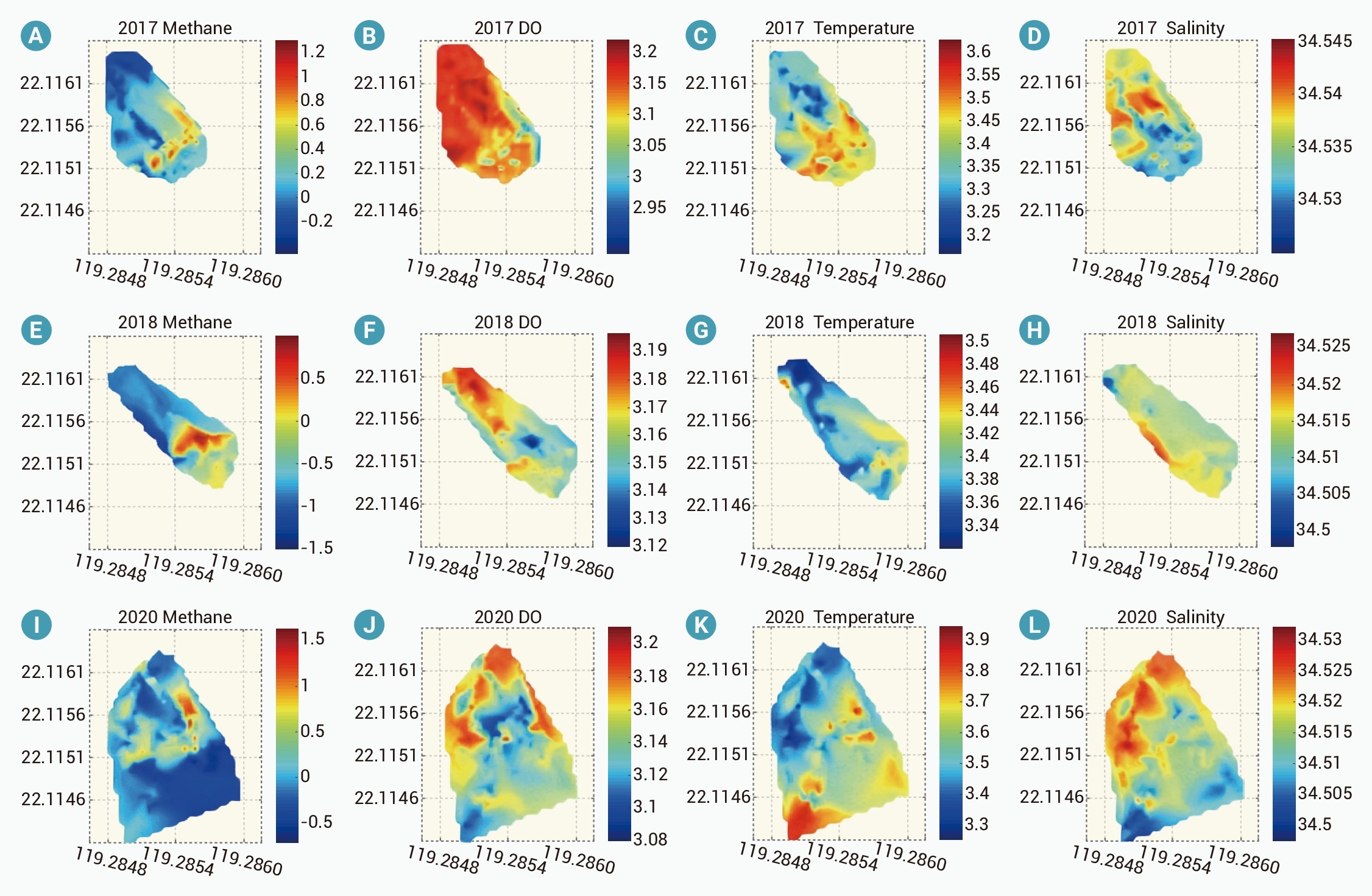 本研究以南海北部陆坡活跃冷泉区Site F为研究对象,结合深海原位探测技术与地球化学稳态模型,定量刻画了冷泉甲烷从海底释放到水体的迁移转化过程。本工作的技术突破在于集成多参数协同探测设备,并进行精细尺度的海底原位环境探测。研究团队利用集成甲烷传感器、溶解氧传感器、底层海流计及温盐深测量仪的多参数传感系统及同步精准取样设备,通过“科学”号科考船搭载的遥控无人潜水器(“发现”号ROV)在2017、2018和2020年三个航次中对活跃冷泉区不同生境近底层海水环境场进行精细探测(图2),克服了传统采样方法的空间代表性问题,实现了对甲烷、溶氧等关键环境参数的连续、高分辨率观测(图3)。