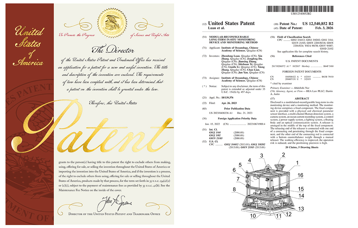 近日,中国科学院海洋研究所在深海原位探测技术及装备研发领域获得一项美国专利授权(图1),该专利主要围绕模块化可重构深海坐底长期观测系统及监测方法申请,是我国深海探测装备领域在国际知识产权竞争中取得的重要成果,彰显了我国在深海原位科学与工程技术交叉融合方面的持续创新力。