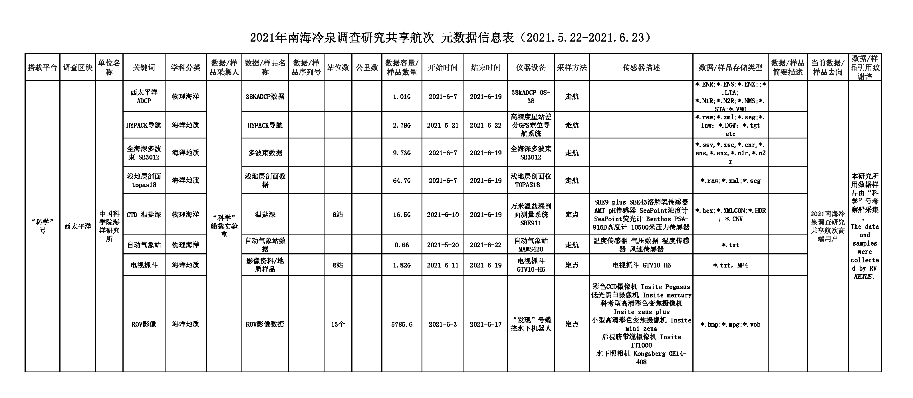2021年南海冷泉调查研究共享航次元数据信息表(2021.5.22-2021.6.23)