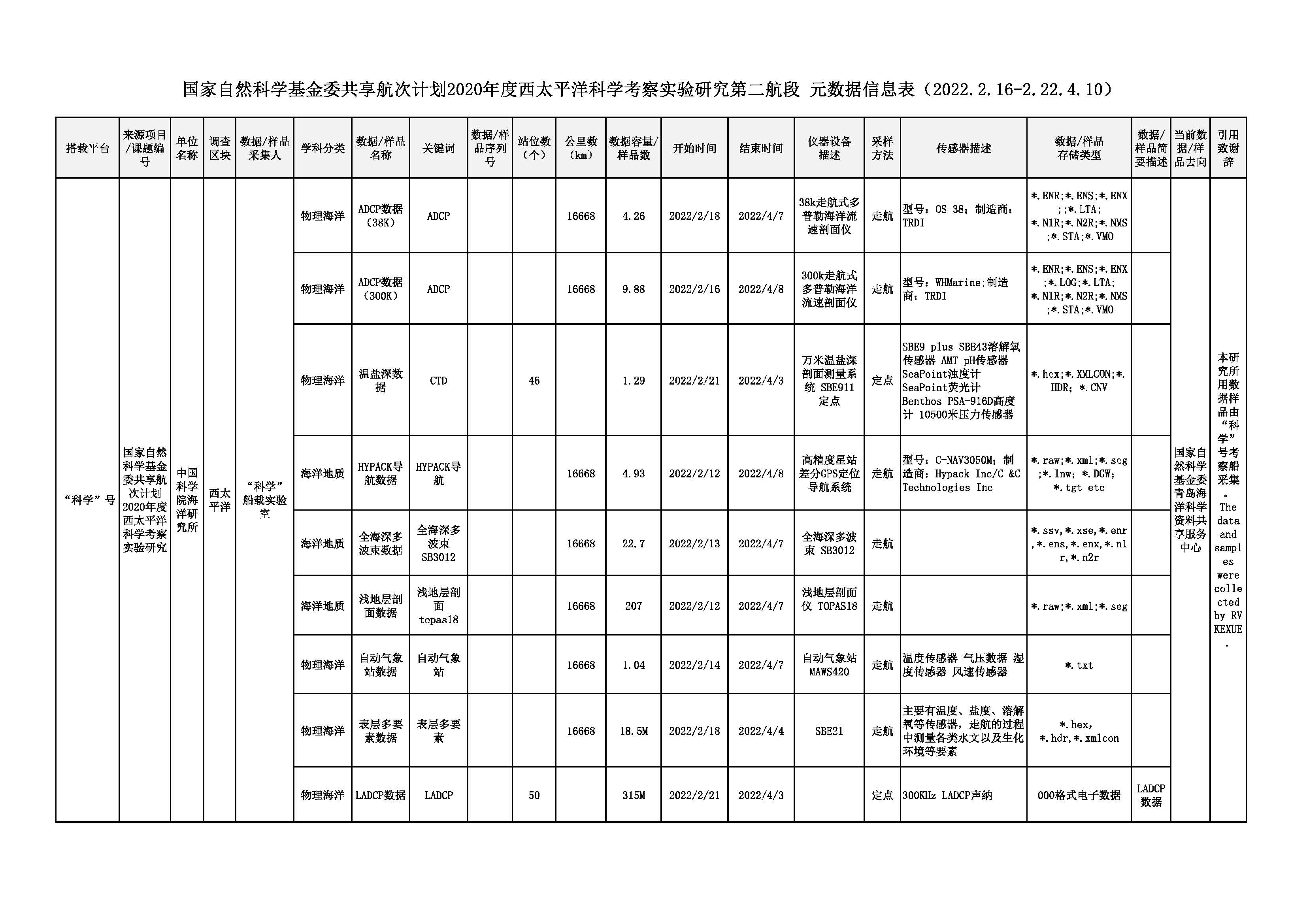 国家自然科学基金委共享航次计划2020年度西太平洋科学考察实验研究第二航段 元数据信息表(2022.2.16-2.22.4.10)