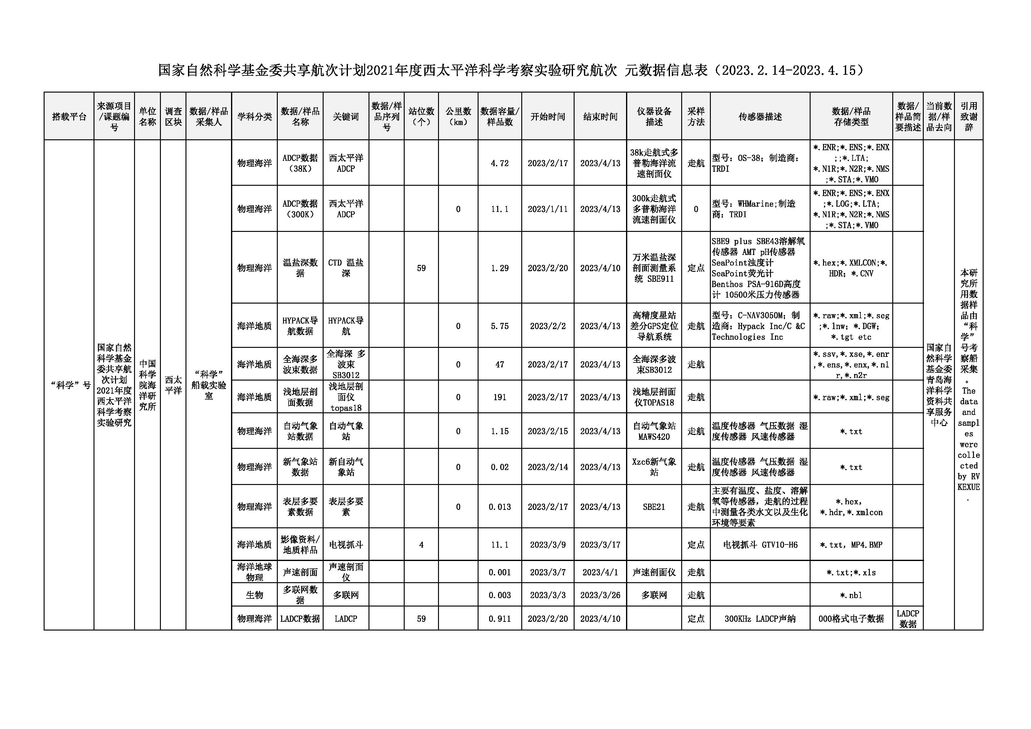 国家自然科学基金委共享航次计划2021年度西太平洋科学考察实验研究航次 元数据信息表(2023.2.14-2023.4.15)