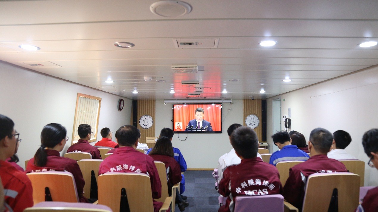 10月18日上午,为迎接中国共产党第十九次全国代表大会的顺利召开,正在执行国家基金委西太共享航次的“科学”号科考船全体党员在学术厅内观看中共十九大开幕会,华东师范大学张经院士,船长刘合义,航次首席科学家周慧,列席观看。