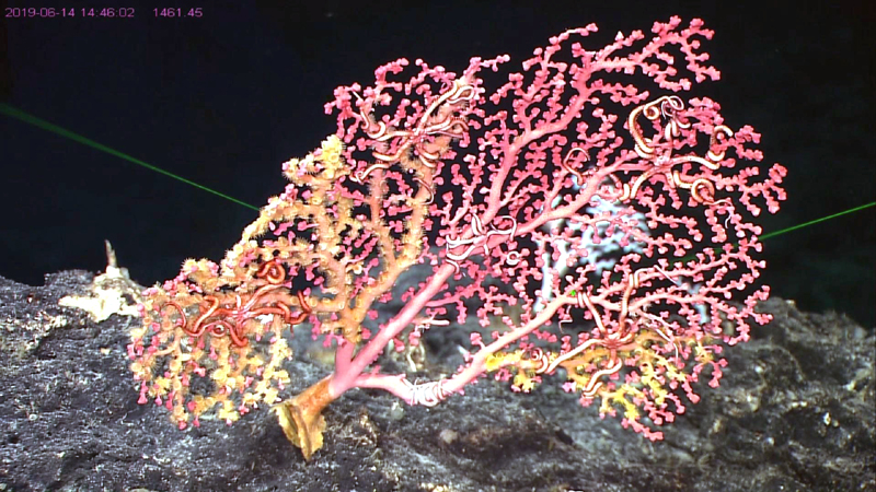 ROV拍摄的红黄相间的珊瑚,即红色的拟柳珊瑚被黄色的群体海葵侵染形成