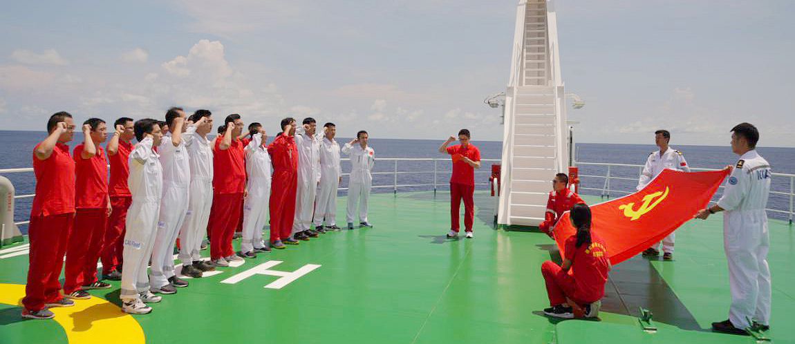2019年10月30日10时40分,正在西太平洋执行国家自然科学基金委2019年共享航次的“科学”号海洋科学综合考察船举行“深海科考行、筑梦新时代”穿越赤道纪念仪式暨重温入党誓词活动。2019-10-31