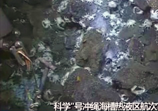 我国最新一代科考船“科学”号17日在西太平洋冲绳海槽进行综合科考时,利用其搭载的水下揽控潜器(ROV)发现了海底黑烟囱的线索,在一些海底火山口发现了阿尔文虾和毛瓷蟹等聚集的群落。