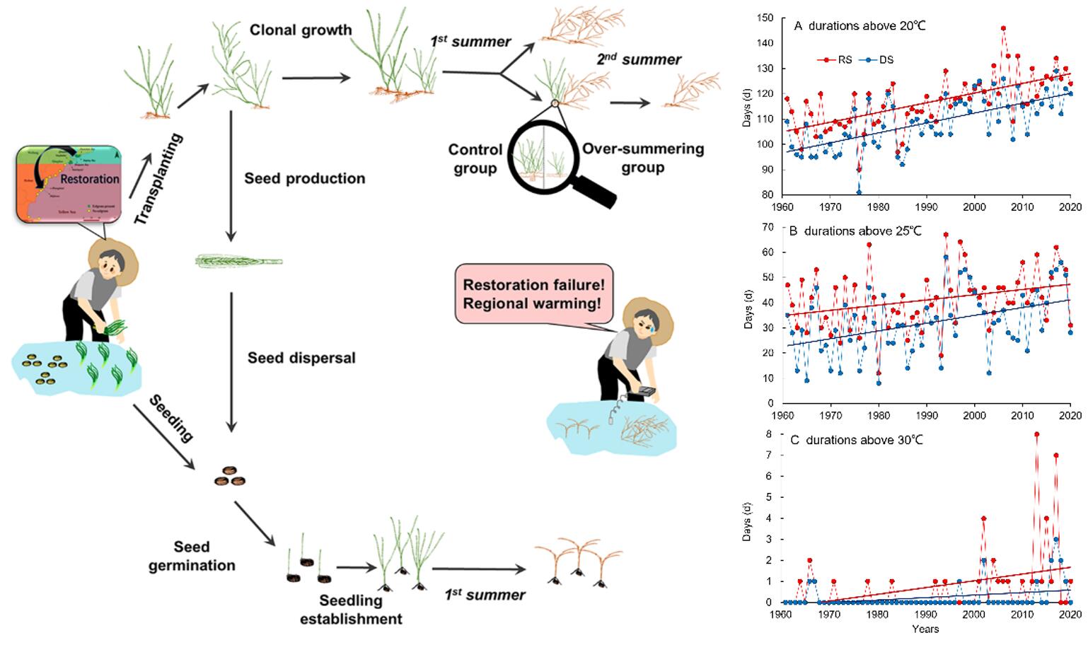 全球变暖将使许多物种的地理分布向极地移动。该研究以温带海域广布海草种——鳗草(Zostera marina L.)为研究对象,对我国鳗草地理分布南界海域(山东青岛-江苏连云港)进行了全面的重新调查,对比历史文献资料发现我国鳗草地理分布南界已发生北移,并由日照石臼所北移至青岛渔鸣嘴。为确定鳗草地理分布北移是否由区域变暖所致,2016年至2021年期间,科研人员从青岛湾获取鳗草植株和种子,在日照石臼所海域共开展了16次鳗草植株移植和种子种植实验,监测海草生长状况及水温等环境参数,并进行海草生化分析和转录组分析。