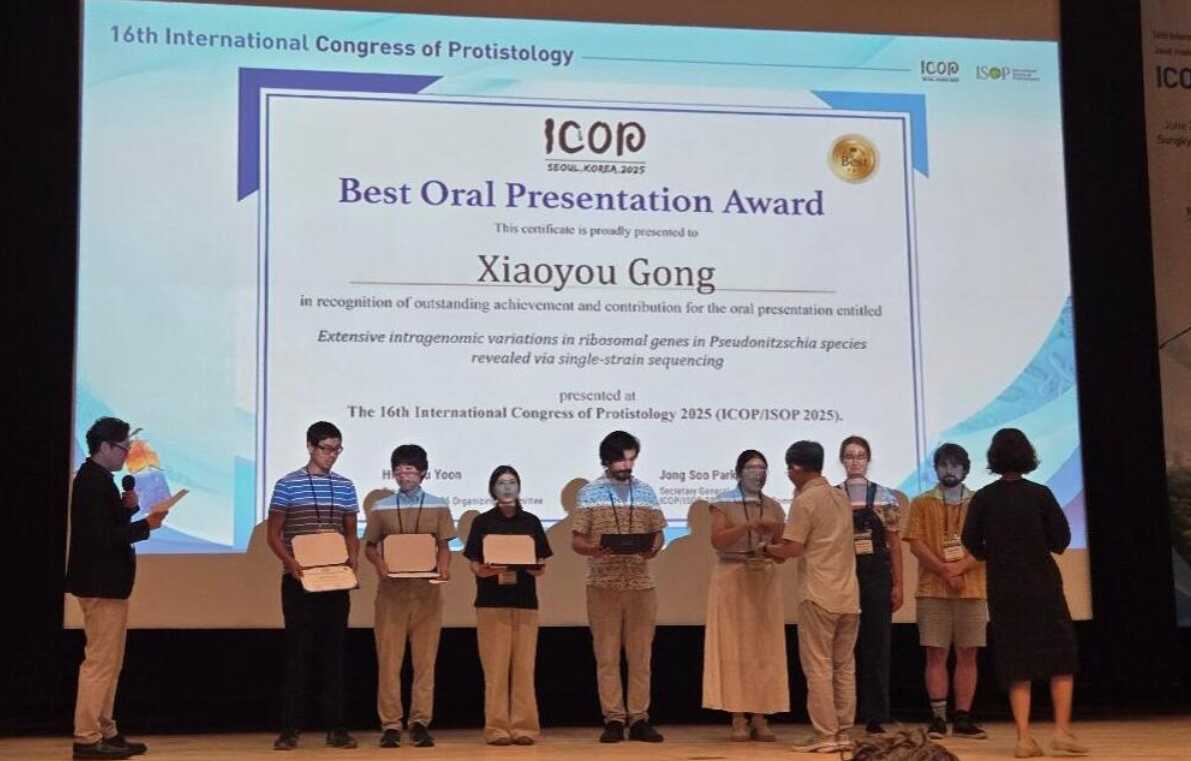 陈楠生团队研究生龚晓优同学在会上荣获“最佳口头报告奖”(Best Oral Presentation Award)。该奖项共有61名学生参评,最终7人获得该奖。龚晓优作了题为“Extensive intragenomic variations in ribosomal genes in Pseudo-nitzschia species revealed via single-strain sequencing”的报告。该研究通过单株系高通量测序,系统地揭示了伪菱形藻核糖体分子标记ITS1存在广泛的基因组内序列变异(IGVs);每一个株系都包括1个优势ITS1序列,以及多个非优势序列;发现一个株系的非优势序列可能是其他株系甚至其他伪菱形藻物种的优势序列。这一发现表明协同演化并不能完全清除非优势序列,也为解读环境DNA宏条形码分析中分子多样性远超物种多样性的现象提供了关键依据,对准确评估海洋原生生物多样性及理解核糖体基因进化具有重要意义。报告内容新颖、逻辑清晰、表达流畅,获得评审专家高度认可,成功摘得该奖项。同课题组的陈楠生研究员和研究生王绘,以及华南师范大学李扬研究员和牛彪彪博士也参与了该项目。