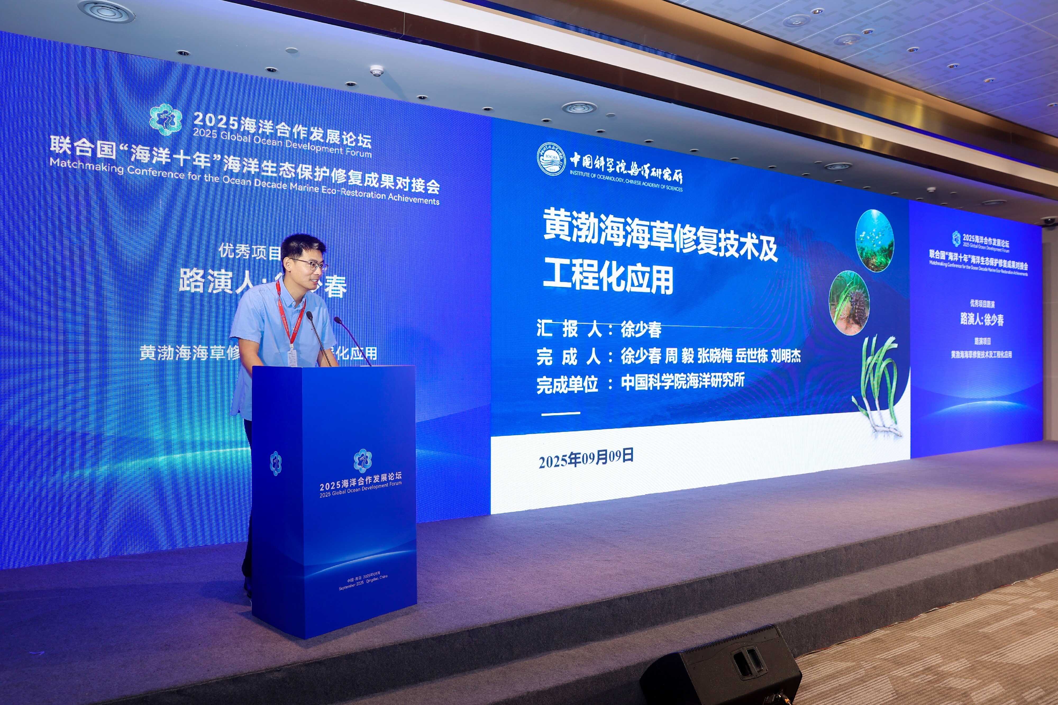 近日,在山东省人民政府与自然资源部共同主办的“2025海洋合作发展论坛”上,首届联合国“海洋十年”海洋生态保护修复大赛评选结果正式揭晓,由中国科学院海洋研究所徐少春副研究员、周毅研究员等人员完成的“黄渤海海草修复技术及工程化应用”荣获创新技术组“重大项目奖”。