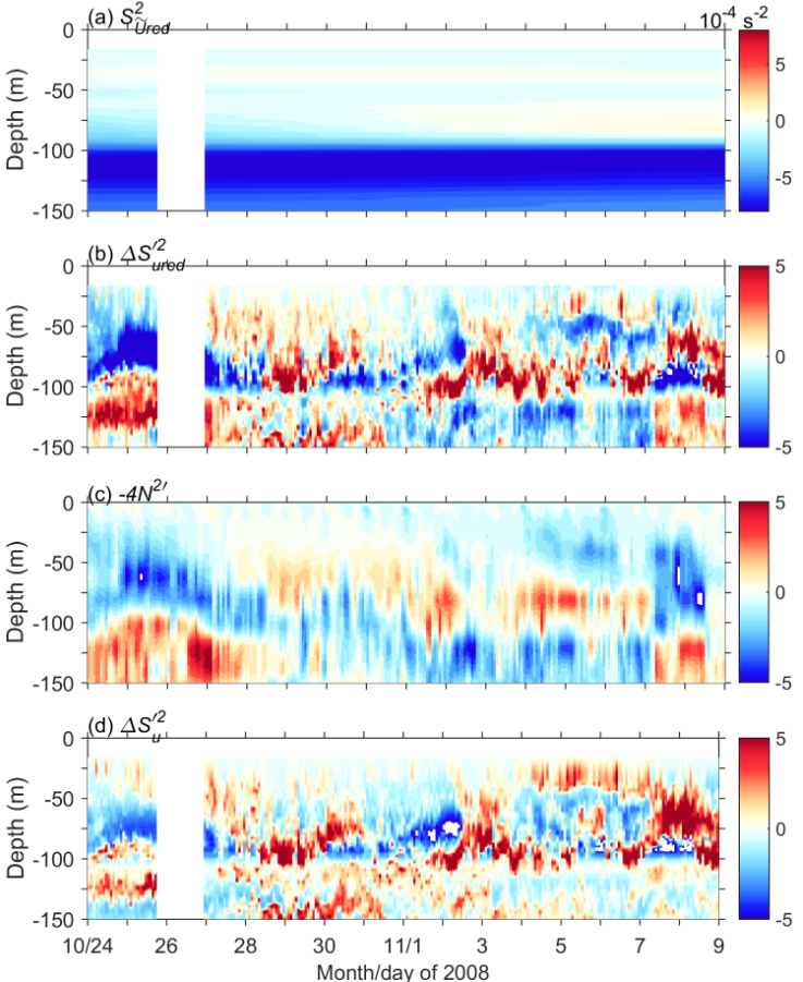 图:(a)不存在和(b)存在多时间尺度赤道波动情形下约化剪切分布情况(值>0指示不稳定和湍流混合,值<0表示稳定和层流无混合),及多时间尺度赤道波动引起的约化剪切的(c)层结变化分量和(d)剪切变化分量(b=c+d)