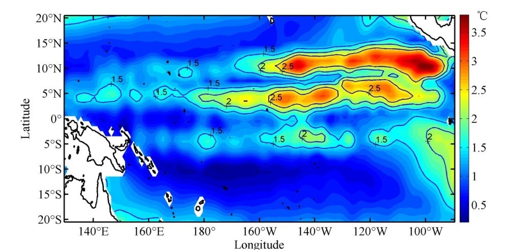 海温季节变化标准差最大层上的温度标准差分布