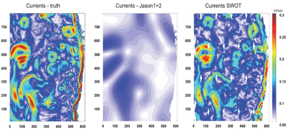 左图为待观测流,中图和右图分别为传统高度计(Jason1+2)和新一代干涉高度计(SWOT)仿真观测数据反演的流