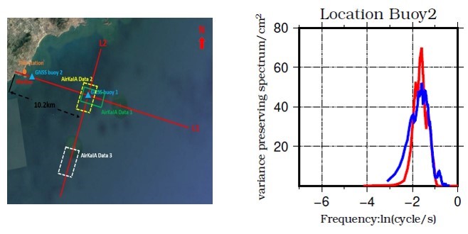 青岛近海试验航线和现场观测布放示意图(左);通过频散关系统一后的时间域海面高程方差保持频率谱图(右,蓝线为GNSS浮标测量结果,红线为宽刈幅干涉高度计测量结果)