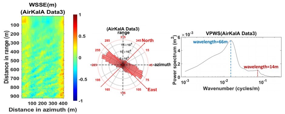 试验结果初步显示出宽刈幅干涉高度计观测的优势,直接呈现出海浪场引起的三维海面高度变化,而之前的大面积海浪场的遥感观测只能通过其对后向散射系数的影响间接体现。高分辨三维海面高度变化的同步观测为海浪研究提供了丰富的信息,而新型数据亟需新的分析方法。徐永生团队继而开发了第一个基于三维高度变化的海浪参数反演方法,能够精确获取海浪波向、波长、有效波高等参数,成果近期在国际学术期刊IEEE Geoscience and Remote Sensing Letters在线发表,文章第一作者是徐永生团队在读博士生姜秋富,徐永生研究员为共同第一作者兼通讯作者。