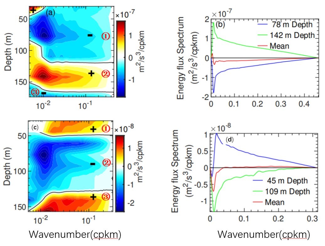 左:(a)和(c)分别是横贯气旋涡和反气旋涡ADCP剖面的动能通量谱,正值表示正向动能串级,负值代表逆向动能串级;右:(b)和(d)是左边对应能量通量谱的典型深度截面,表明涡旋内部正向串级的动能与逆向串级的动能大部分可以抵消