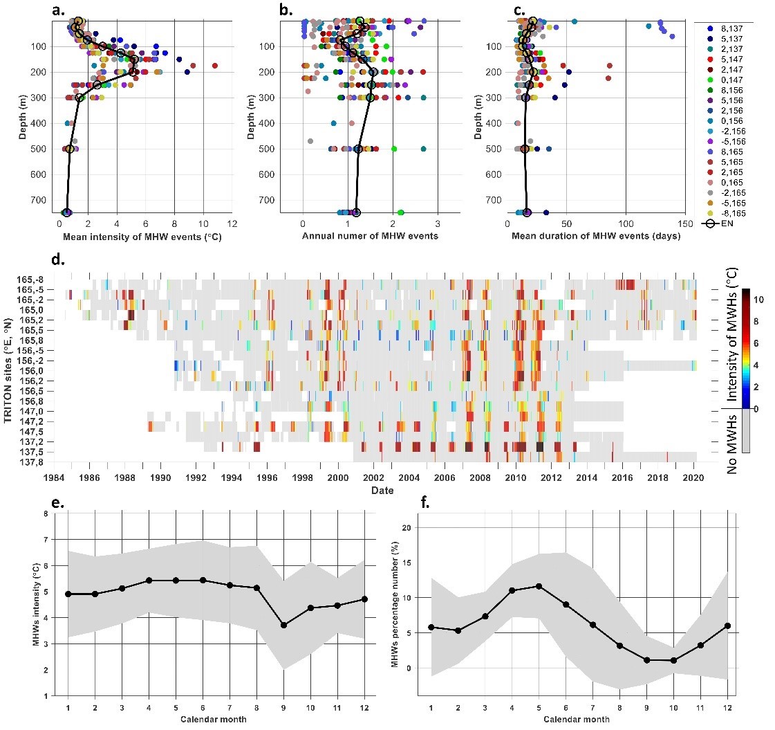 热带西太平洋次表层海洋热浪的平均强度(a)、年发生次数(b)和持续时间(c)。中图为各站位次表层海洋热浪强度时间序列(d),下图为次表层海洋热浪强度(c)和百分比数(f)的季节变化