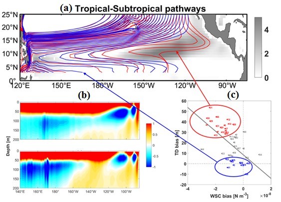 朱聿超等人利用最新发布的CMIP6数据,发现气候模式在热带西北太平洋和5°N以内的赤道区域产生一个过浅的温跃层,而在热带东北太平洋产生一个过深的温跃层。同时以8°N为中心形成偶极子结构的温跃层强度误差。热带北太平洋中的温跃层误差主要是由海表面风应力旋度误差引起,其又可以进一步归因于热带北太平洋长期存在的double-ITCZ误差。此外,热带东北太平洋中的温跃层误差又可以归因于海洋模式中背景扩散系数的不真实表征。当用观测的扩散系数代替当前模式中的给定值,可以有效提高模式中热带东北太平洋的温跃层强度。温跃层误差会严重影响海洋环流的模拟,主要包括NECC模拟偏弱,海洋内部向赤道的水体输运模拟过少和边界过于向东延伸。