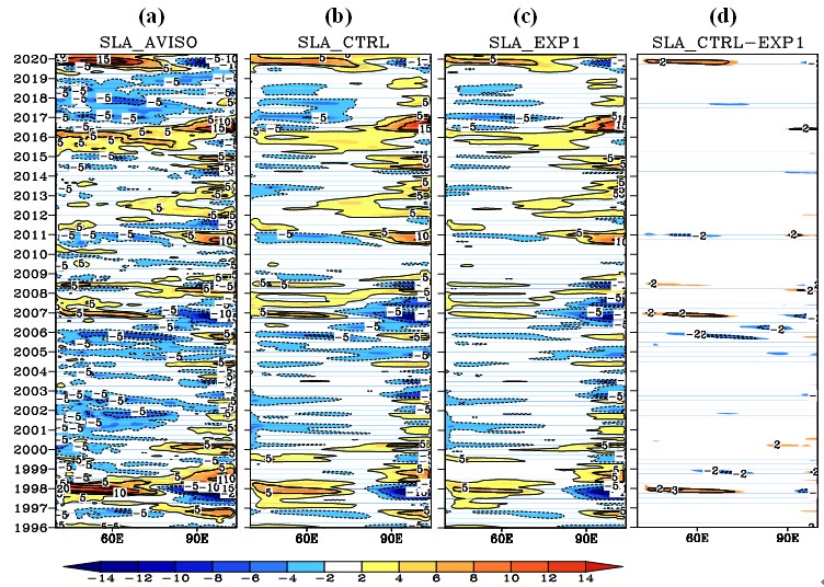 观测(a)、逐日风场CTRL(b)和低频风场(去除季节内变化)EXP1(c)强迫实验模拟的SLA,以及季节内风场变化调制的低频SLA(d)