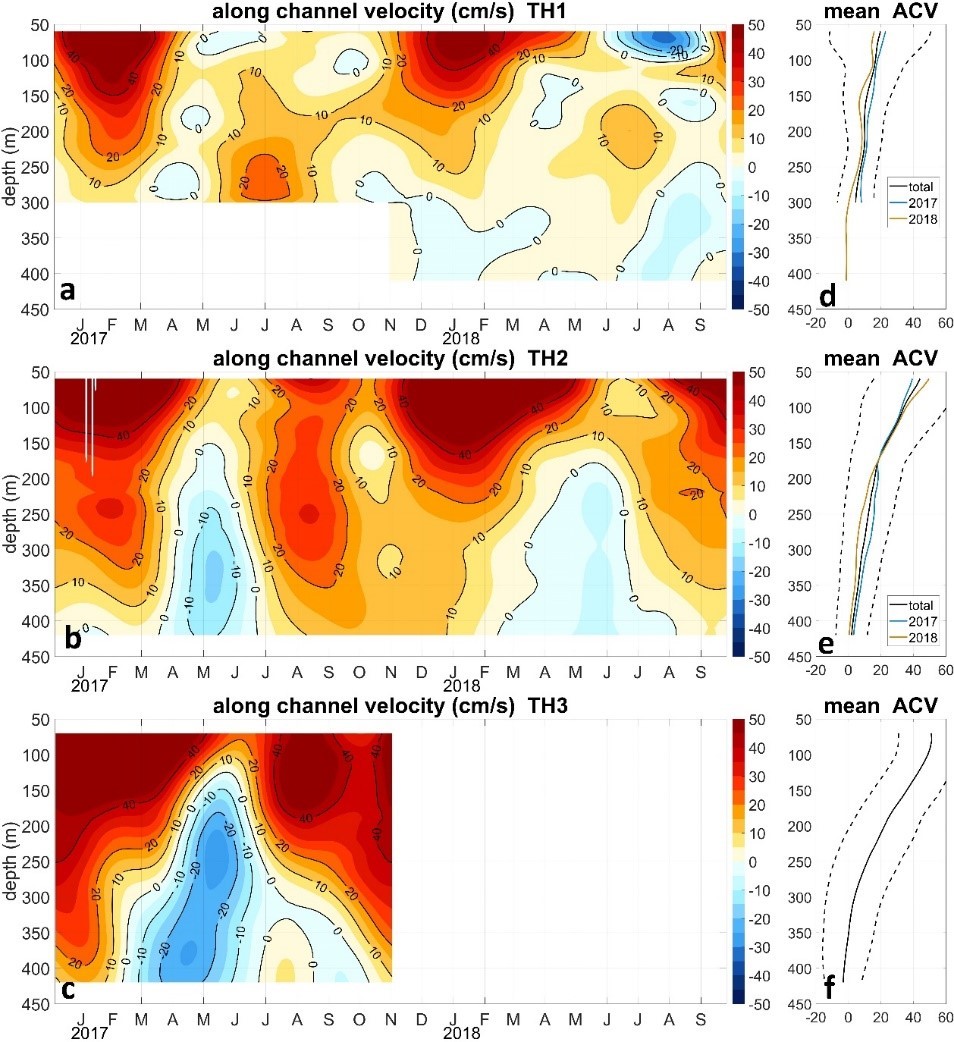 本研究基于国际合作的定点观测数据,结合走航观测数据,揭示了棉兰老流的强烈季节摆动现象并揭示其机制。研究分析显示,TH海峡的海流变率以季节尺度及以上的低频变化为主,上层海流存在显著的年循环,冬季为东北向,夏季为西南向。水团、水色与海表面高度等数据进一步证明,这种年循环的变化是由于棉兰老流(MC)的季节性摆动引起的。棉兰老流在北半球冬季向南入侵马鲁古海后向东折返,形成北赤道逆流的源头,而在夏季则向北退却,在塔劳岛附近直接转向东。流态季节变化的机制可以用袁东亮课题组前期的两支西边界流相遇的非线性多平衡态理论来解释(Wang and Yuan 2012, 2014 JPO)。棉兰老流与新几内亚沿岸流相对强度的变化,决定了棉兰老流的路径变化,从而决定了TH海峡海流的季节变化。在200米以下的次表层,4-7月存在一支西向的海流。CTD数据显示,其水团性质为高盐的南太平洋热带水。2年平均的TH海峡60-300米的平均流量约为10.1-13.2 Sv,由北马鲁古海流向西太平洋。