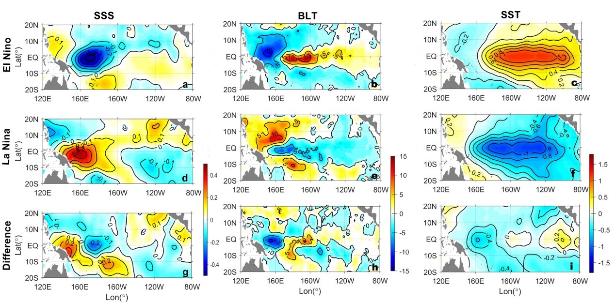 厄尔尼诺-南方涛动(ENSO)对全球气候系统具有非常重要的影响,其冷暖位相非对称性等复杂性特征和机理,是物理海洋和气候学领域的热点研究方向。经过几十年的研究,人们从大气-海洋动力学角度基本建立了ENSO的理论框架。然而,近年来却发现气候模式对ENSO的预测能力并未随时间持续提高,其中一个重要原因是对ENSO复杂性的理解和认识仍有不足。海洋盐度是影响ENSO循环的一个独具特色的因子,可以通过影响海洋层结和热障效应促进ENSO事件的发展,然其在ENSO非对称性中的作用仍不清楚。