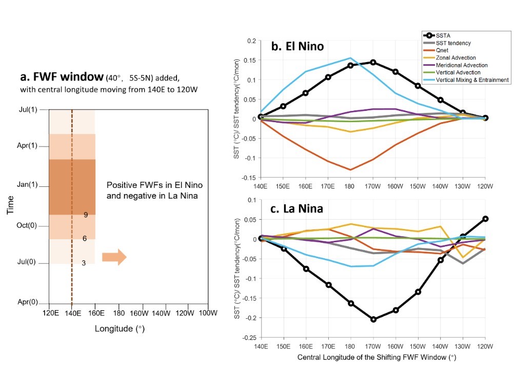 王凡研究团队深入研究了海表盐度的纬向结构对ENSO海温非对称性的影响。通过系列敏感性数值实验发现,ENSO变率强度对盐度异常出现的纬向位置十分敏感(图2)。当盐度异常出现在赤道中太平洋170°W附近时,引起的ENSO变率最显著(增强ENSO变率达25%),且ENSO变率强度随着盐度异常出现的位置向东、西太平洋方向递减。基于温度收支分析发现,盐度引起海温变化主要是通过增强了混合层底的垂向夹卷和混合作用来完成的。以El Nino为例,降水增多引起海表盐度降低,混合层变薄,混合层底的垂向温度梯度减小,减弱次表层冷水的垂向夹卷和混合作用,导致海表温度增暖而加强了El Nino事件。在La Nina中反之亦然。而当盐度异常出现在中太平洋时,垂向夹卷和混合作用最强烈,因而对海表温度的影响最大。相比于La Nina期间出现在西太平洋的盐度异常,出现在中太平洋的盐度异常更大程度地促进了El Nino事件的发展。结果表明,盐度异常在ENSO冷暖位相中不同的纬向结构,是ENSO非对称性的重要形成机制。