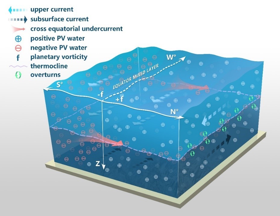 新发现的这一大尺度能量耗散混合的机制在于:2017年拉尼娜期间,新几内亚沿岸潜流的增强导致其携带更多的次表层南太平洋负位涡水跨过赤道后,进一步被较强的哈目黑拉涡携带到达5oN附近的北赤道逆流区,在此处较强的垂向地转剪切作用下,产生对称不稳定诱发湍流混合。该成果也是大尺度环流-中尺度涡旋-亚中尺度过程-小尺度湍流之间能量级串的一个典型例证,得到海洋混合研究方向国际知名专家美国布朗大学的Baylor Fox-Kemper教授的高度赞赏。他在其评审意见中认为这个发现非常新颖且有很大的应用价值,特别是对粗分辨率气候模式模拟具有重要参考价值。