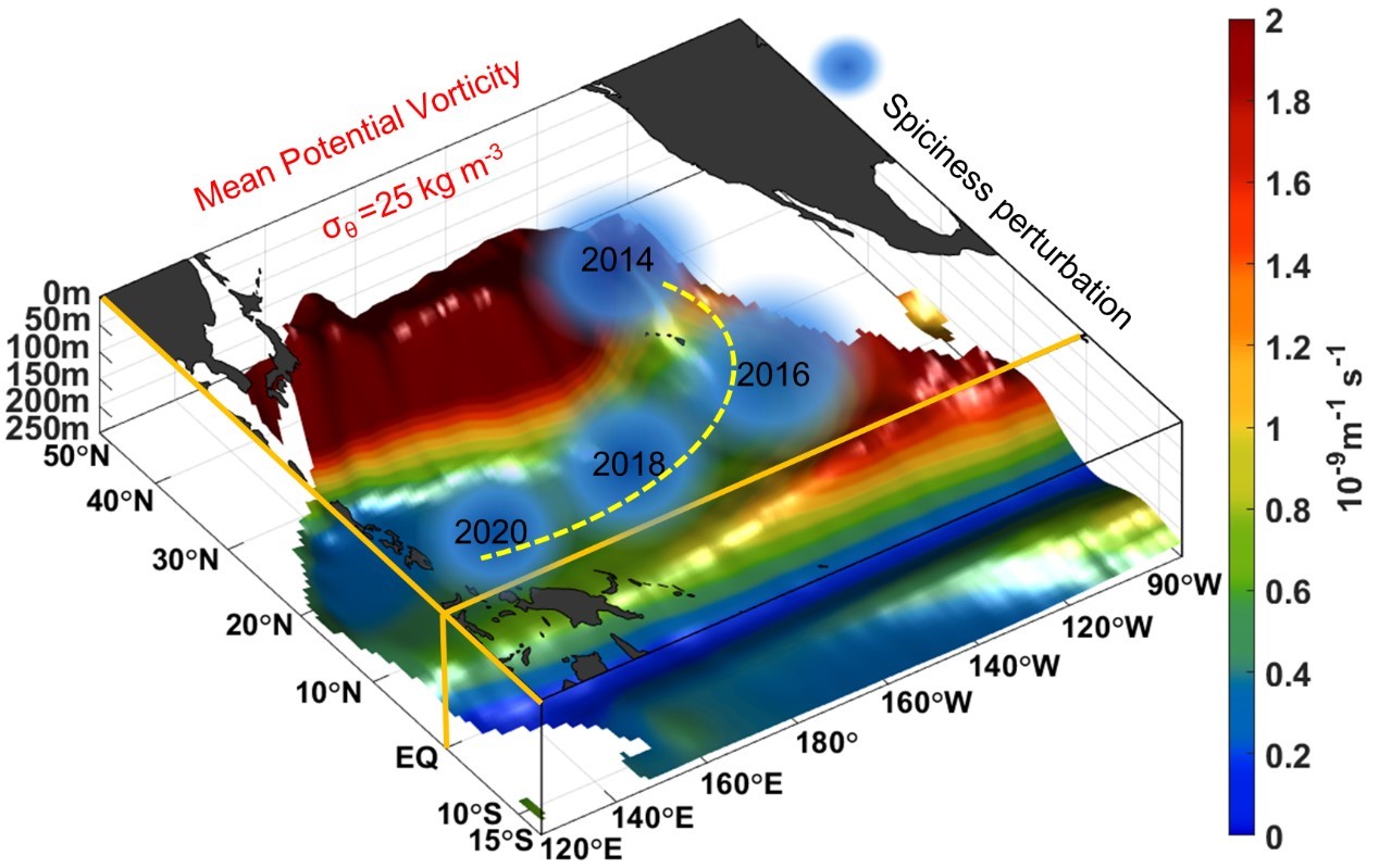 北太平洋25 kg m-3等密度面上平均位势涡度(Potential Vorticity; PV)的空间结构和涩度信号(Spiciness signals)在次表层海洋潜沉通道上传播的示意图。图中表示一个冷而淡的涩度负异常信号在2014-2020年间沿北太平洋副热带流涡环流场向西南方向传播进入西太平洋热带海区(其中显示了不同年份时涩度扰动中心位置),从而会影响局地的次表层热力结构和海表温度等