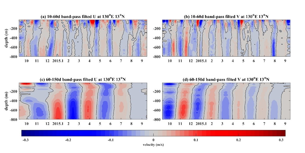 近日,中科院海洋所胡敦欣院士团队在北赤道流与北赤道潜流季节内变化研究方面取得新进展,发现北赤道流区垂直方向上同时存在的两种类型季节内变化信号并揭示其动力机制,相关成果近日在国际学术期刊Frontiers in Marine Science在线发表。