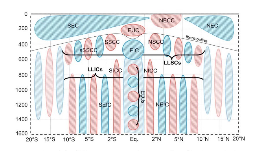 赤道中层流东西纬向交替变化的结构特征,引自Ménesguen et al. (2019)。本研究关注位于赤道上400-1000米的EIC及EDJs的一部分
