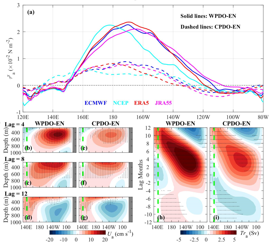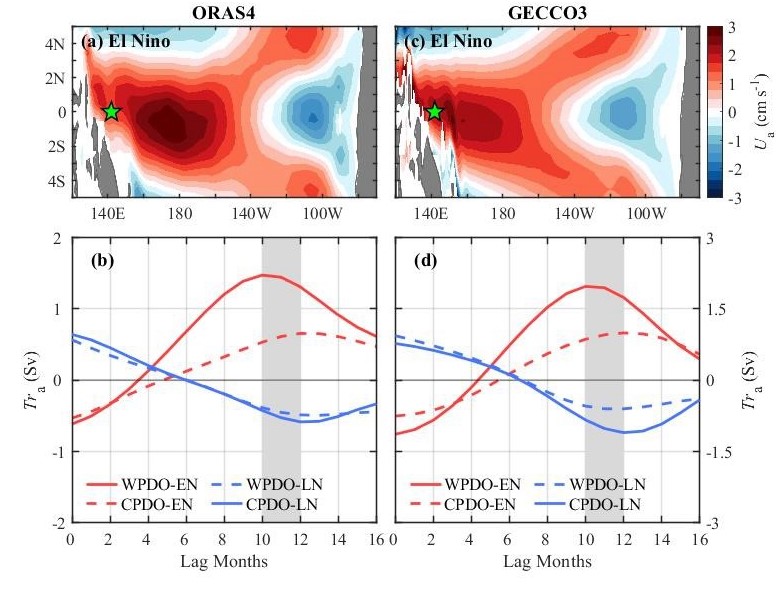 赤道中层流系统会在滞后厄尔尼诺事件10-12个月时出现较强的东向流异常。在此基础之上,研究团队利用长时序的再分析数据发现该东向流异常在年代际尺度上进一步受PDO的调制。PDO暖位相下厄尔尼诺引起的中层流输运异常最大值是PDO冷位相下量值的2倍,且发生时间提前2月。进而利用连续层化模型的系列数值试验,研究揭示上述PDO的年代际调制作用主要归因于PDO引起的赤道中太平洋风场变化。相比PDO冷位相,PDO暖位相下厄尔尼诺事件中赤道中太平洋的西风异常更强且位置偏东,其激发的Kelvin波最大振幅更大且位置偏东,Kelvin波在东边界反射成Rossby波,Rossby波的垂向传播引起西太平洋中层输运异常的最大值更大且发生时间更早。