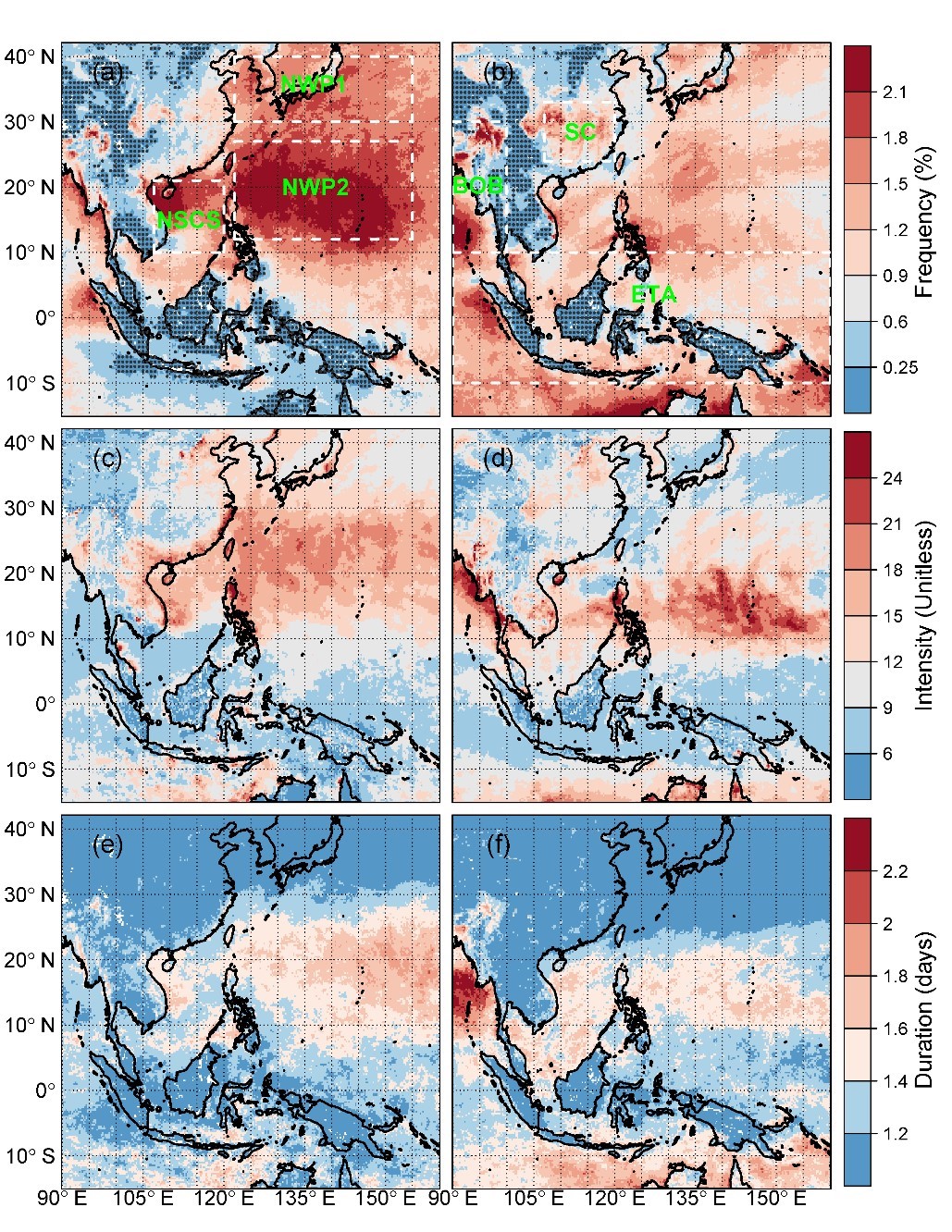 1979-2020年印太区域复合型极端风雨事件气候态平均(a,b)频率(%),(c, d)无量纲强度和(e, f)持续时间(天)。左侧为夏半年结果,右侧为冬半年结果。