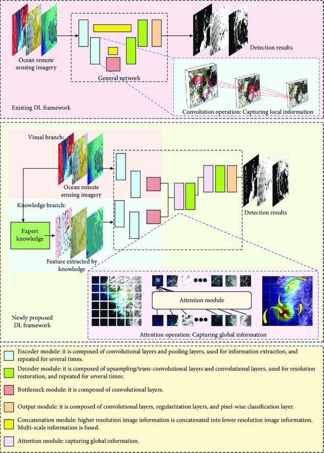 文章指出,在未来的海洋遥感图像处理中,应将深度学习模型结构的先进性和领域知识(专家知识)相结合。注意机制强调全局信息和局部信息的结合。海洋理论领域知识为深度学习模型提供了更准确的输入特征,降低输入数据维度的自由度。二者相互作用推动人工智能海洋学的发展。