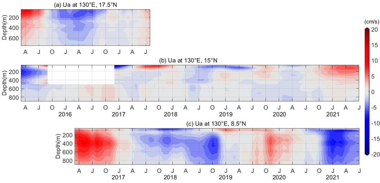 2015年—2021年130°E断面潜标ADCP在(a) 17.5°N,(b) 15°N,和 (c) 8.5°N 观测到的纬向流速异常时间序列,所有时间序列均经过1年低通滤波