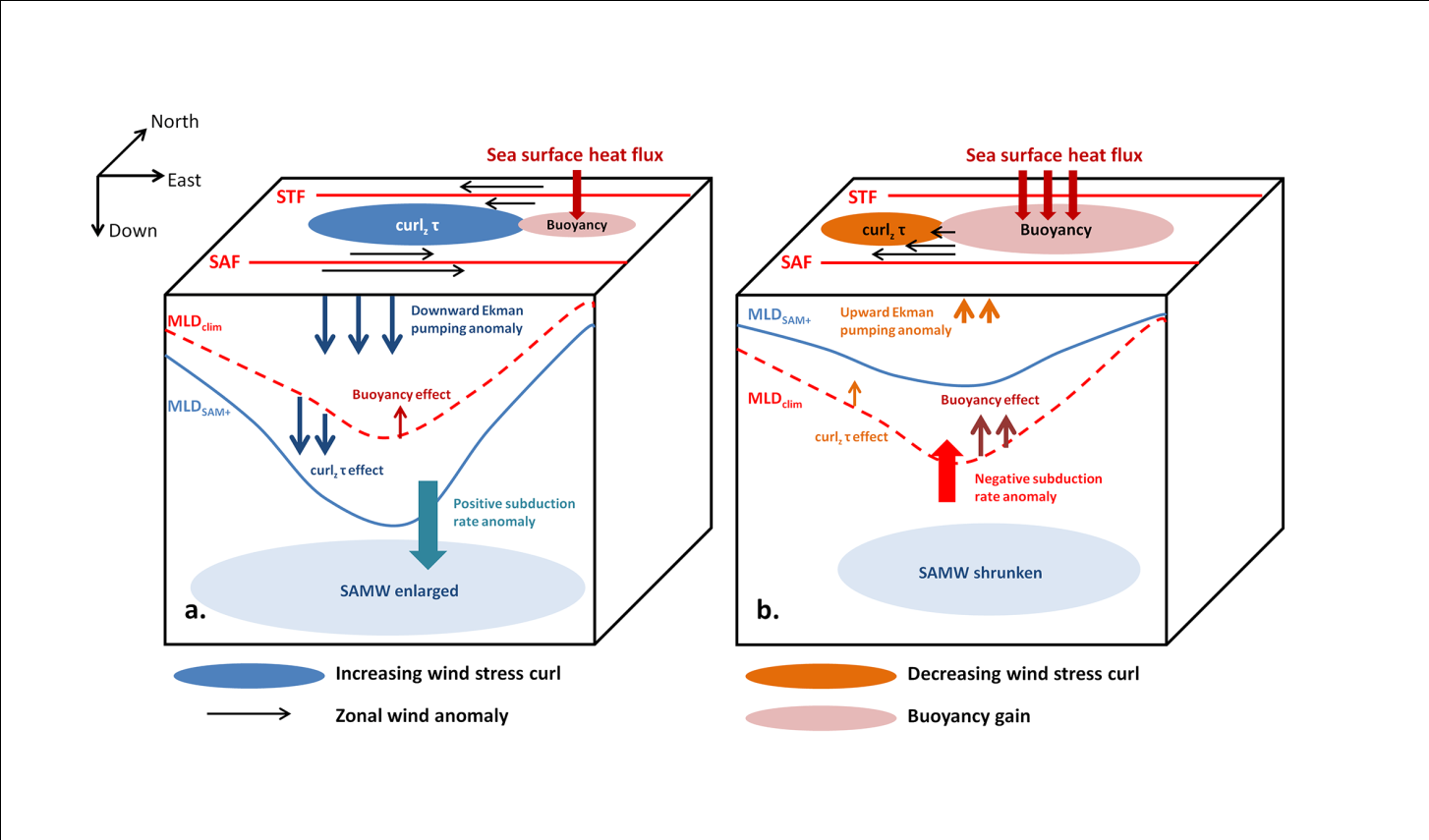 图1. 南大洋环状模正位相期间,亚南极模态水在a)印度洋及b)太平洋和大西洋变异机制的示意图