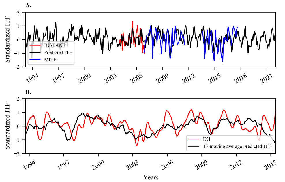 研究团队进一步将该系统与1993年至2021年的卫星实测资料结合,反演构建了印尼贯穿流流量的时间序列,并发现该时间序列与MITF、INSTANT和IX1等国际知名的印尼贯穿流现场观测数据资料吻合较好。研究团队利用该系统进一步探索了对印尼贯穿流流量进行预测的可能性,结果表明该系统能够实现超前7个月对印尼贯穿流流量的有效预测。研究团队建立的印尼贯穿流人工智能反演和预测系统为开展印太海洋环流与气候变化研究提供了重要手段,或可在一定程度上减轻现场海洋观测的压力。