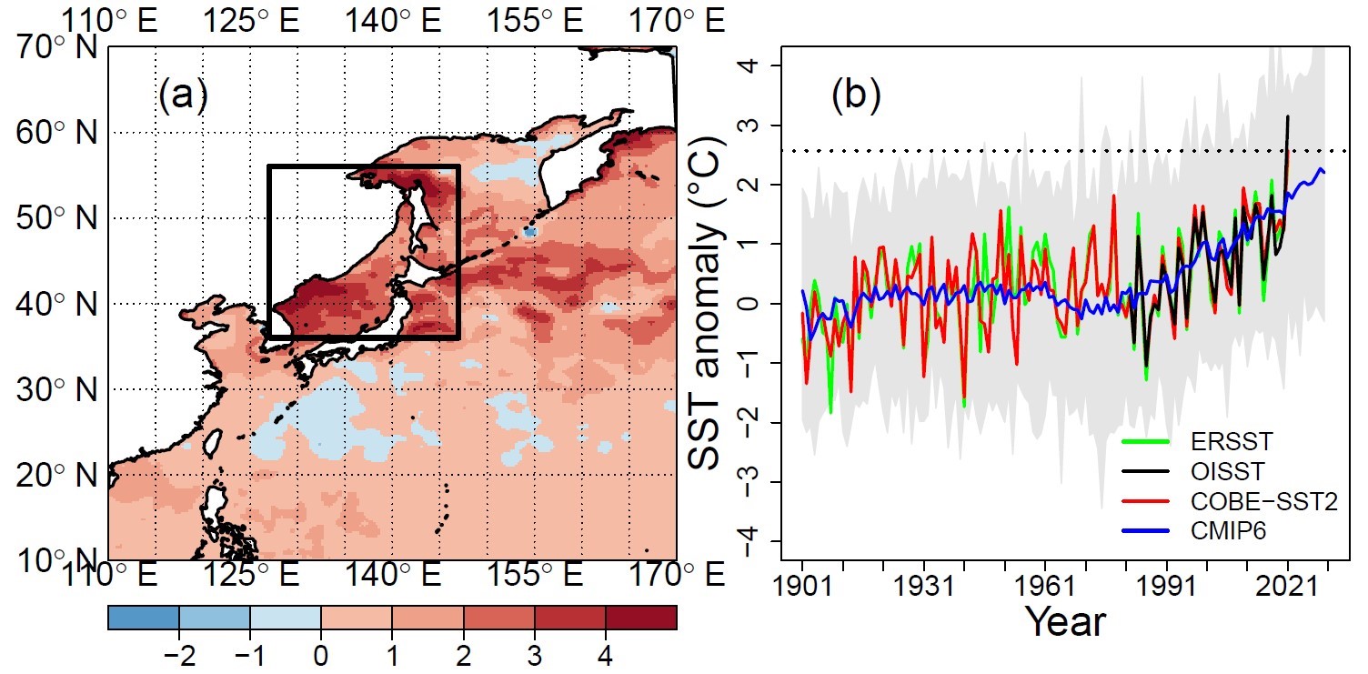 图1. (a) 2021年7月西北太平洋区域海表温度异常,图中黑框为本研究关注区域;(b) 不同观测数据及CMIP6多模式集合平均的海表温度异常区域平均时间序列