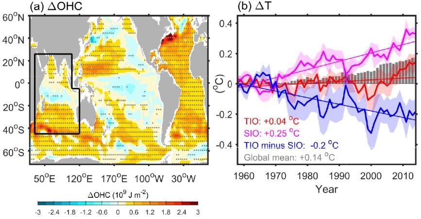 图1. (a) 观测集合平均在1958-2014年期间0-700米的海洋热含量变化。黑线显示了印度洋海区范围。(b) 热带印度洋(TIO; 40°-100°E, 15°S-26°N)、南印度洋(SIO; 30°-115°E, 45°-22°S)的0-700米平均温度演化和二者之差,灰条代表全球平均值