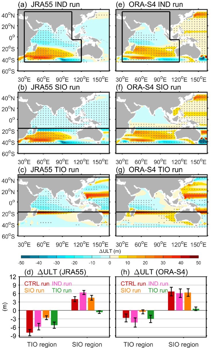 图2. 1958-2014年的上层厚度异常变化(ΔULT),基于JRA55风强迫的 (a) IND实验,(b) SIO实验和 (c) TIO实验。(d) 不同实验中TIO和SIO区域平均的ΔULT。(e-h) 与 (a-d) 类似,但为ORA-S4风场强迫的结果